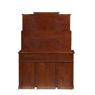 the superstructure of breakfront outline with an arrangement of short drawers and cupboards; on a base with a red leather writing surface above three slides and short drawers and a central kneehole cupboard flanked by further cupboards, on a plinth base with castors