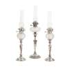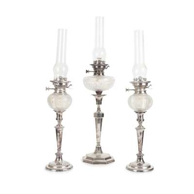 including a larger lamp with a silver octagonal waisted candlestick base, hallmarked maker Hawksworth, Eyre & Co Ltd, Sheffield 1905, the cut crystal reservoir with screw fitting and a Hinks No.2 Lever patent plate burner; together with a pair of smaller lamps with circular waisted candlestick bases with gadrooned detail, the diamond cut crystal reservoirs mounted with a Hinks's Duplex Patent plate burners, also with a group of glass flumes