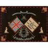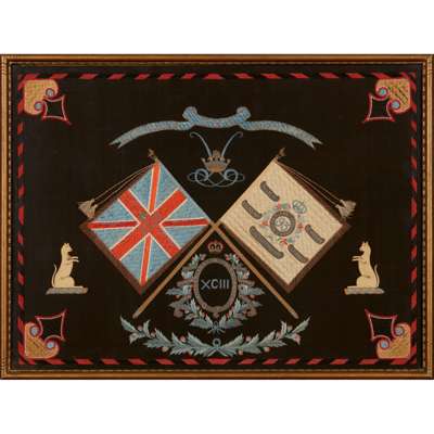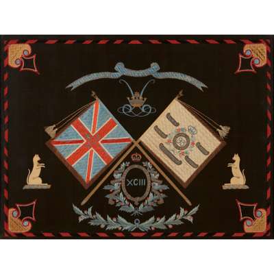 embroidered on a black ground with the Union Jack and regimental flags of the 93rd Regiment with the crowned double L monogram of Princess Louise flanked by two heraldic cats, later framed