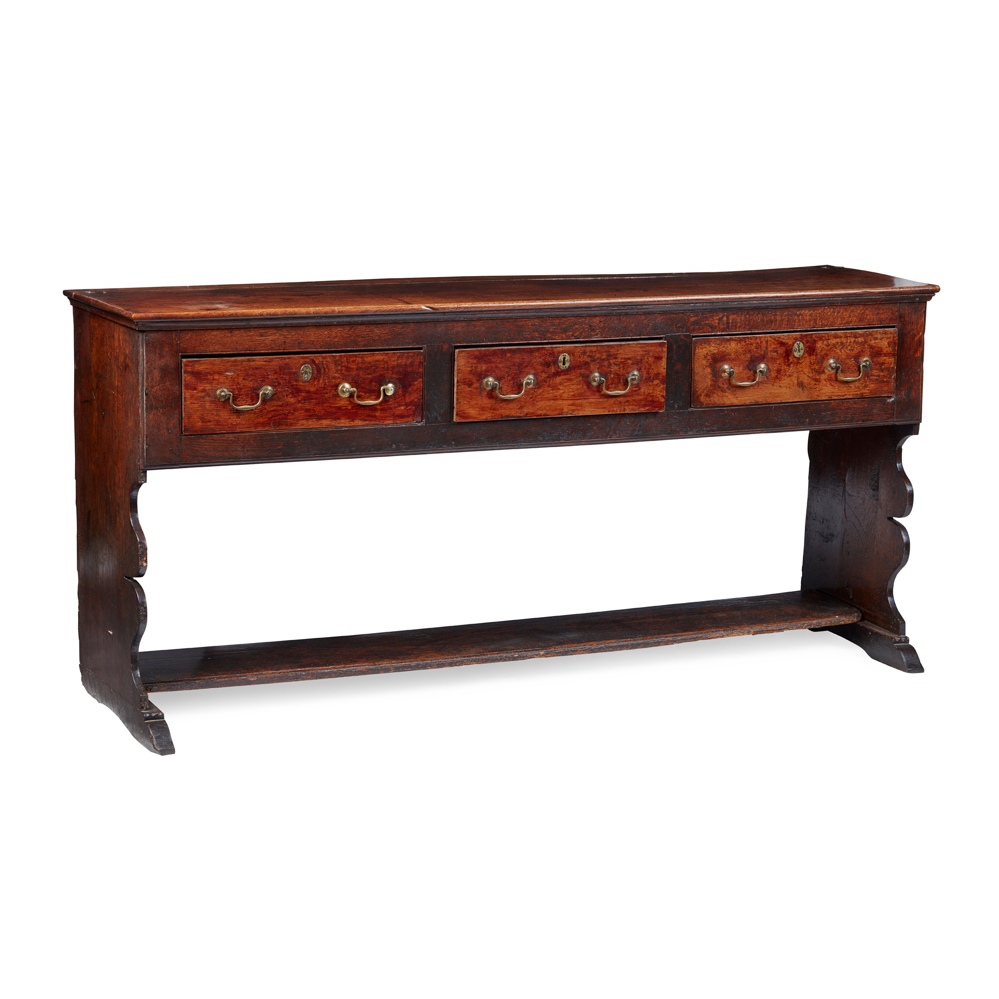 with three short drawers on shaped end supports joined by a potboard shelf