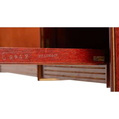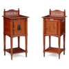 the square tops with a pierced gallery back and moulded edge above cupboard door, one with a jasperware inset plaque the other with a carved ebonised panel, raised on square tapered legs joined by an undertier; stamped on the door GILLOW & CO. L9942