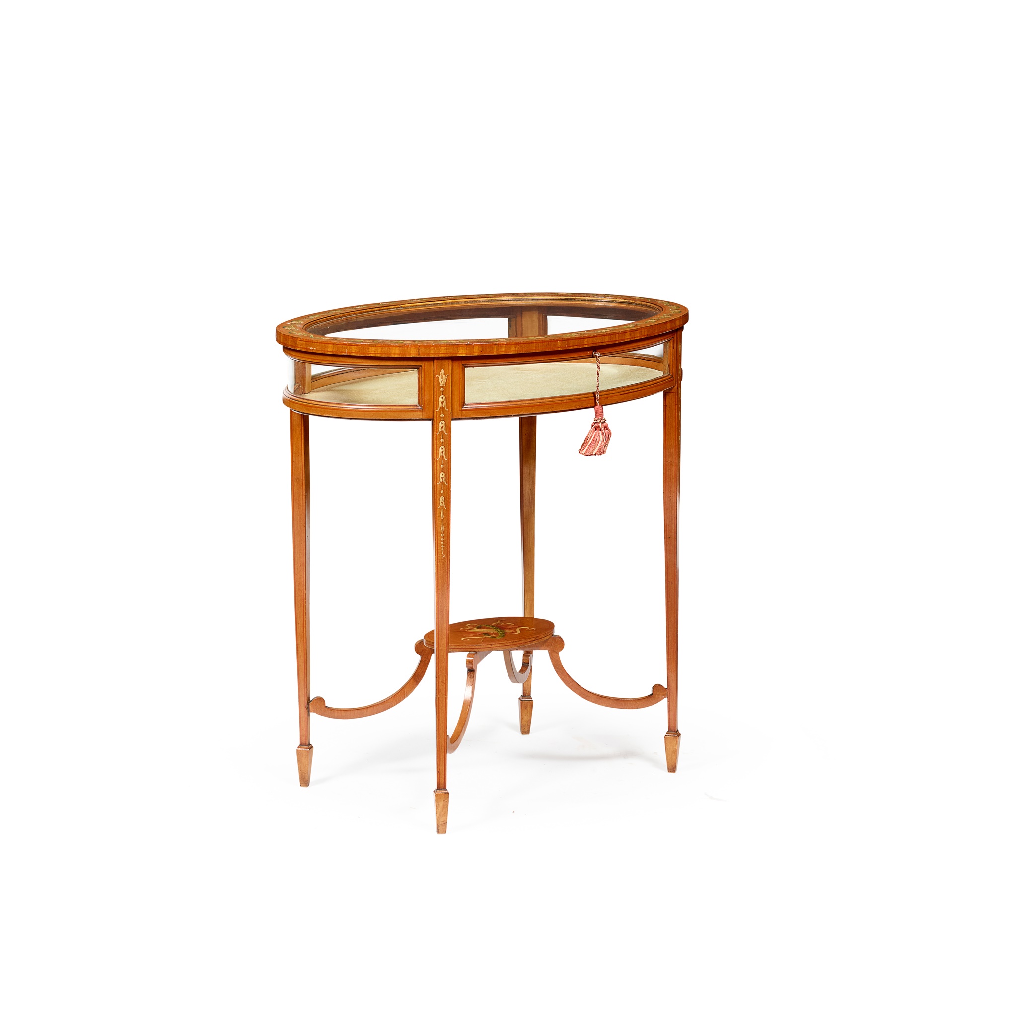 the oval hinged glazed top painted with roses and ribbons raised on square tapered legs painted with harebell trails and joined by arched stretchers and an oval platform undertier painted with a musical trophy