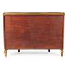 the shaped bowfront top with a painted border and centred with an oval reserve of a courting couple, above a long frieze drawer painted with poppies and putti, over four conforming doors with further oval reserves with scenes with 18th century pastoral figures, flanked and divided by gilt reeded columns with foliate capitals and raised on gilt toupie feet