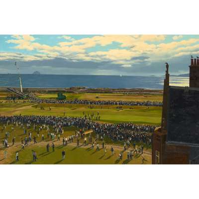 Note: This painting represents the British Open held at Troon in 2004 and won by the American Todd Hamilton who defeated Ernie Els after a four hole play-off.