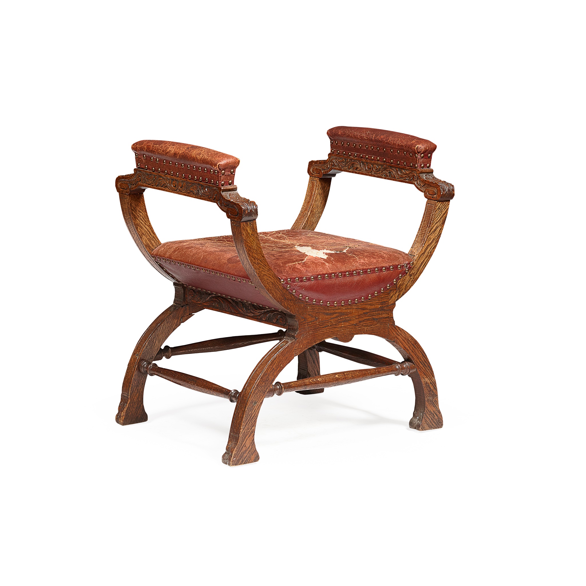 the padded seat and part-padded arms in brown hide, in a foliate carved X frame centred by a lion's mask