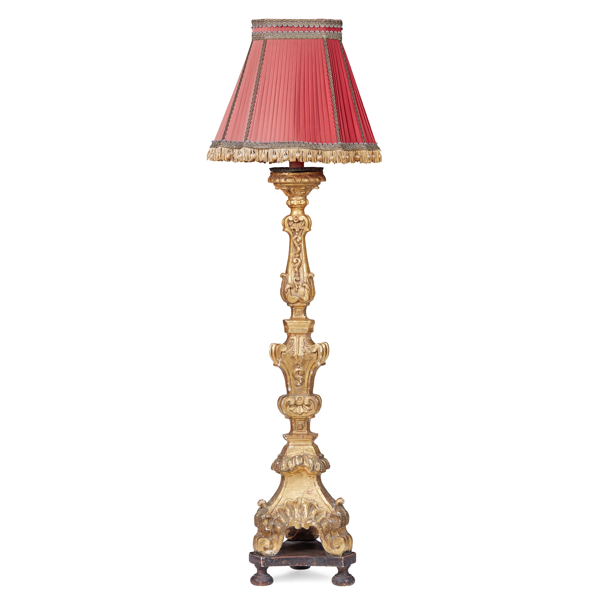 in the baroque style, carved with shell motifs, C scrolls, and acanthus scrolls, on an ebonised tripartite base with bun feet, converted to electricity, with a pleated red silk shade