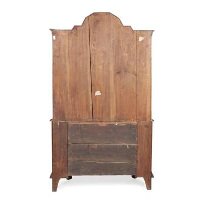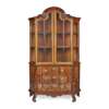 the arched moulded cornice above a pair of glazed and mullioned doors and side lights enclosing green plush lined shelves; the lower part with three serpentine fronted drawers flanked by angled cupboard doors, raised on scrolled feet