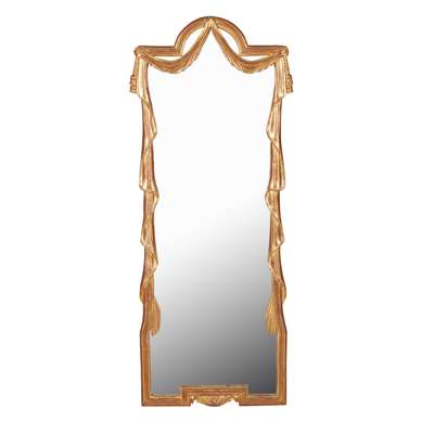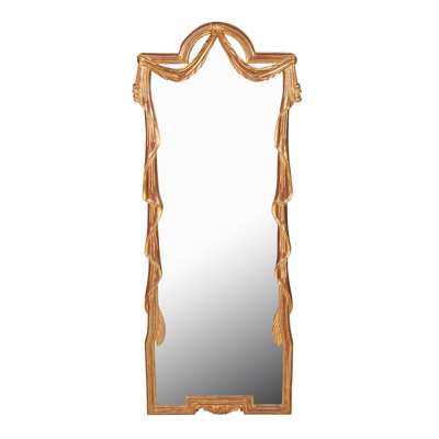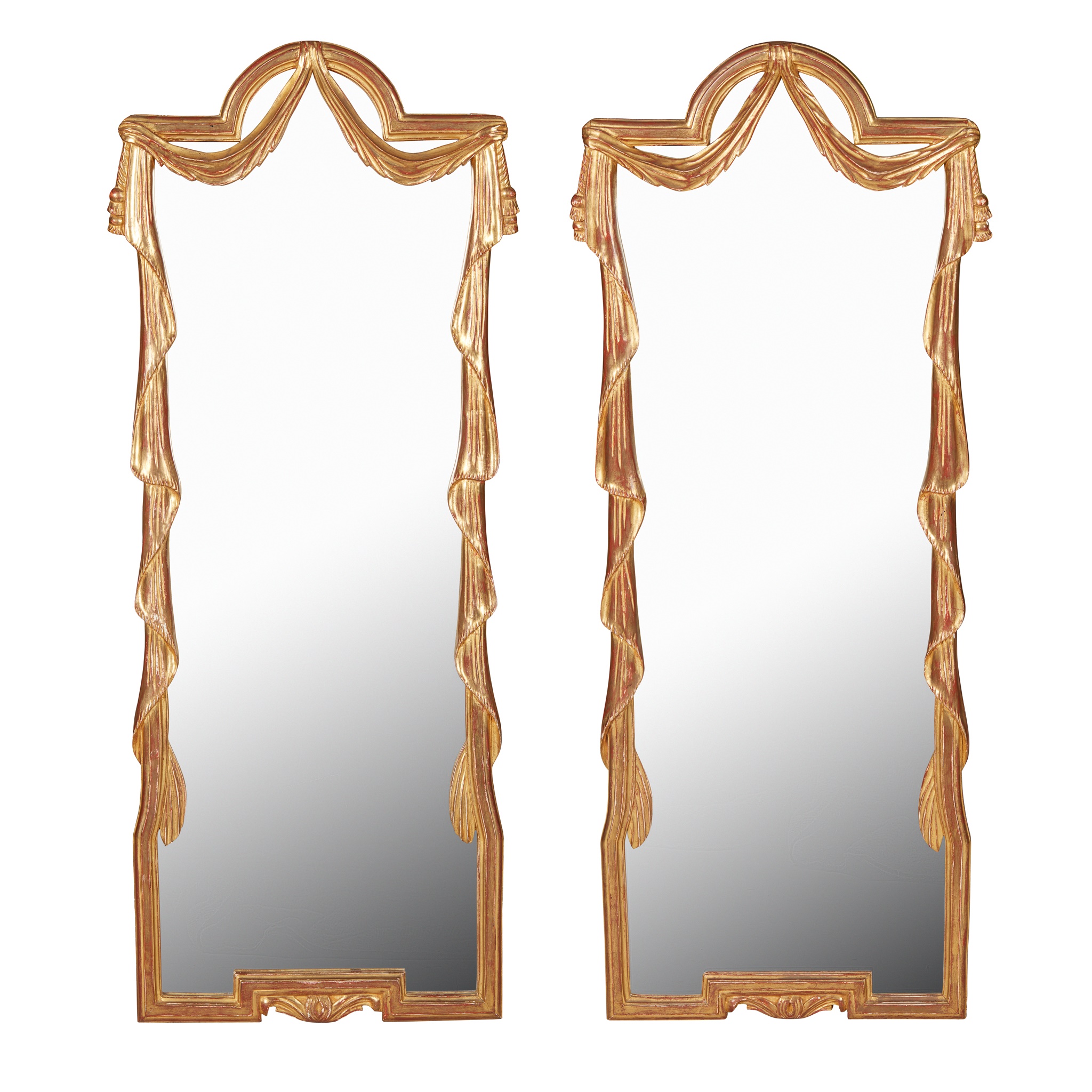 the upright mirror plates with broken arch crests, in giltwood frames with carved drapery swags