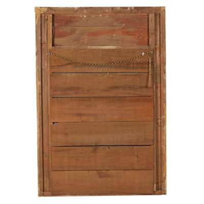 the frieze with a ribbon-tied wreath and garlands above the rectangular mirror plate, in a ribbon-moulded slip and green painted outer frame
