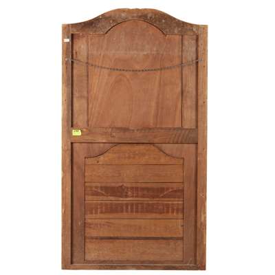 the arched yellow back panel painted with ribbon-tied swags above a painted oval riverside scene and arched mirror plate