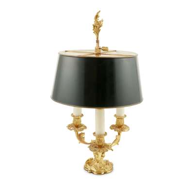 GILT METAL AND GREEN TOLE SHADE BOUILLOTE LAMP