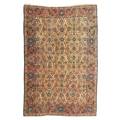 the cream field with allover rosette, palmette and vine pattern, within rust red border