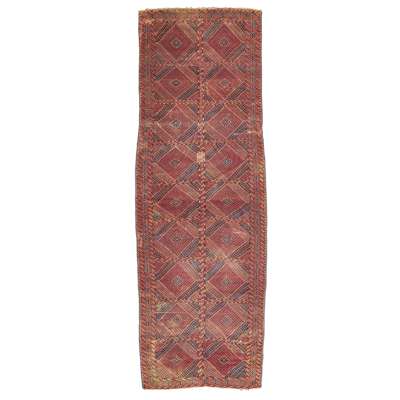 the field with central pole and two columns of red and indigo lozenge medallions, within narrow red and indigo border