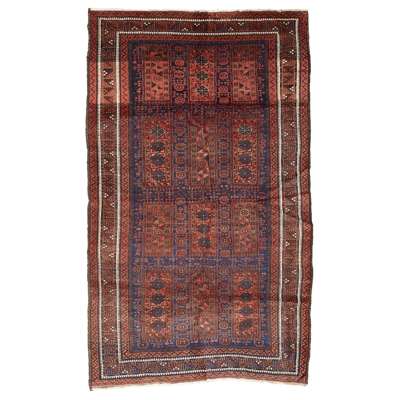 the indigo field with three columns of four red and brown rectangular motifs, within brown border