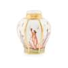 of baluster form, with recessed panels, each painted with chinoiserie decoration showing a figure at leisure, the ridges with gilt bands, the flat cover with a gilt stylised flower-head and c-scroll decoration, both marked with the numerals 36