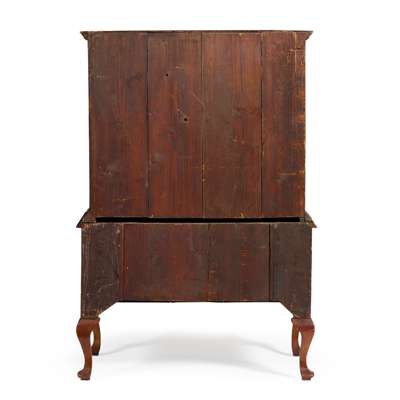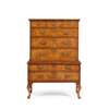 the moulded cornice above three short and three long drawers; on a base with two further long drawers, raised on square cabriole legs