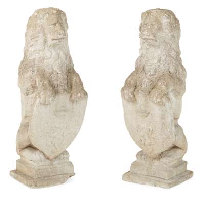 PAIR OF COMPOSITION STONE ARMORIAL LIONS