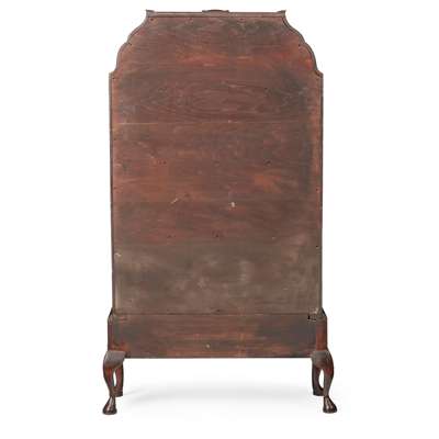 the top with a three-quarter gallery above shaped sides and three graduated open shelves over a pair of base drawers, raised on short cabriole legs with shell-carved knees and pad feet