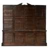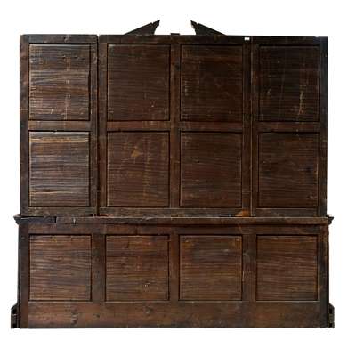 the broken pediment above a deep central cabinet with a pair of astragal glazed doors enclosing compartmented deep shelves, flanked by matching doors enclosing further shelves; the base with a central slide with leather skiver above a pair of moulded panel doors enclosing shelves and flanked by banks of four graduated drawers, on a conforming plinth base