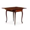 the serpentine top with drop-leaf sides above a frieze drawer to one end, raised on slender moulded cabriole legs ending in leather castors