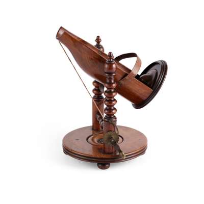 the cradle on turned supports with a brass pulley, on a turned circular base with bun feet
