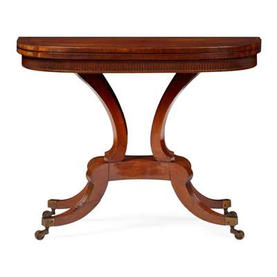 the crossbanded fold-over top with pivot action, above a reeded frieze, raised on four C scroll supports and platform base with hipped reeded sabre legs ending in brass caps and castors
