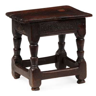 the plank top with a thumbnail edge, above a leafy lunette carved seat rail on turned and tapered legs joined by a peripheral stretcher