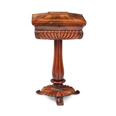 of sarcophagus form with a gadrooned body, opening to two covered removable tea caddies, raised on a reeded baluster column on a lobed circular base with three scroll carved feet