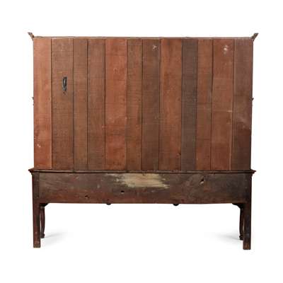 the upper part with a closed back and dentil moulded cornice above a pierced and wavy frieze, over a long shelf and two further shelves flanked by banded cupboards and short drawers enclosed by quarter columns; the base with three deep frieze drawers above a wavy apron, raised on cabriole legs ending in pad feet