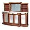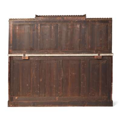 the superstructure with a pierced brass gallery and bead moulding above a central mirror plate flanked by shelved compartments, flanked and divided by gilt metal columns and trellis supports; on a breakfront base with a white marble top over three frieze drawers with Sèvres style porcelain mounts, over mirrored doors enclosing shelves, all flanked and divided by spiral turned columns, on a bead moulded plinth base