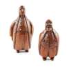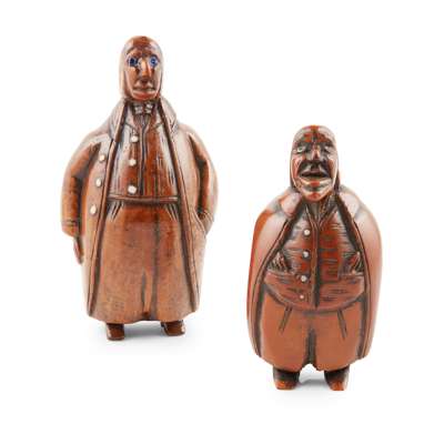the larger example depicting a rotund man with a hook nose and glass bead eyes, wearing an open greatcoat over a waistcoat and trousers, with whale tooth buttons, the hinged coat tails opening to a void interior; the second with a jutting chin and long hair, wearing an open greatcoat with his hands in his waistcoat pockets, whale tooth buttons, the hinged coat tails opening to a void interior