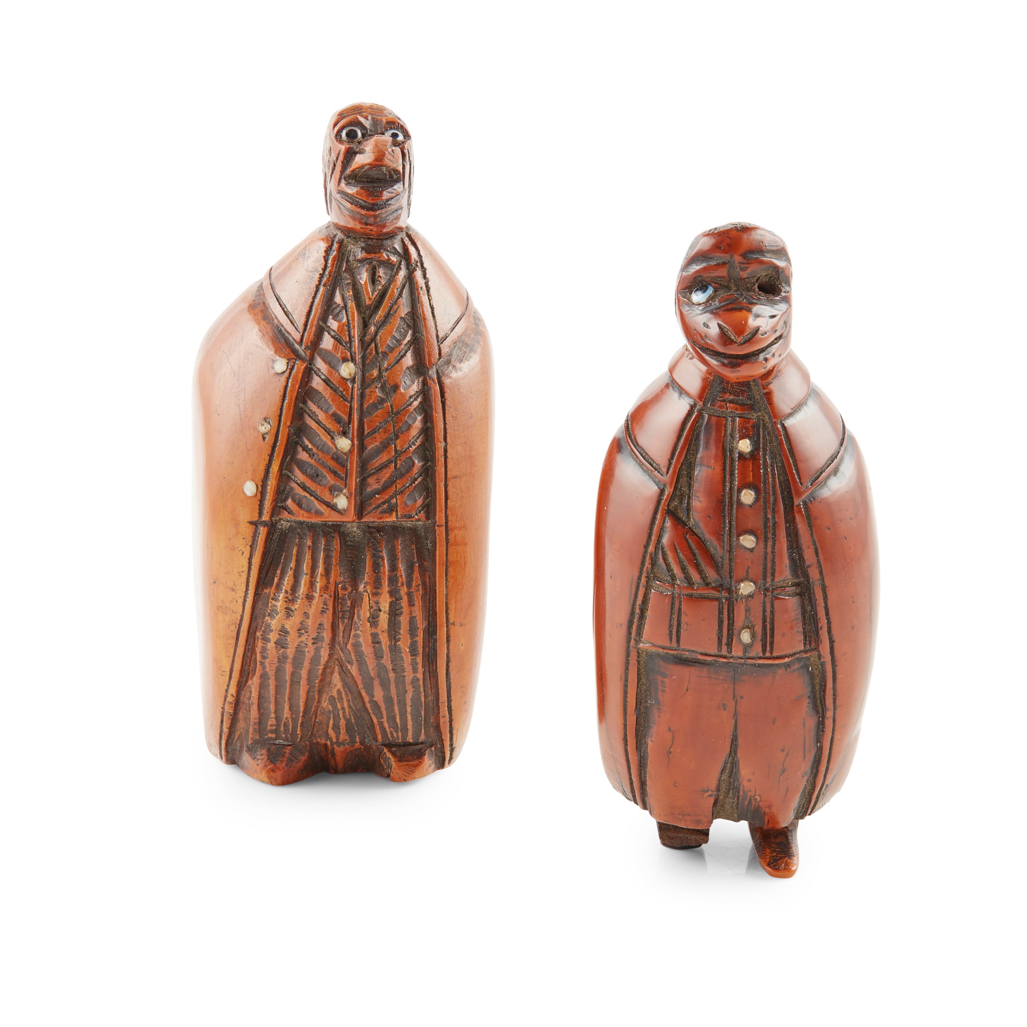 the first example depicting a man with a hook nose and glass bead eyes wearing an open greatcoat and ribbed waistcoat and trousers, with whale tooth buttons, the hinged coat tails opening to a void interior; the second depicting a man with an open greatcoat and striped waistcoat with horn buttons, the hinged coat tails opening to a void interior