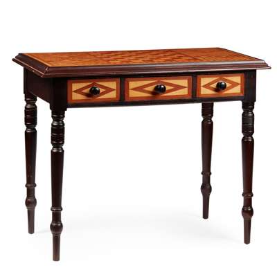 the rectangular top with a moulded edge and inlaid with a games board and chequer and diamond motifs, above three short drawers, raised on turned and tapered legs