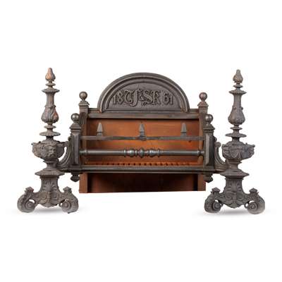the arch pediment backplate with cast with initials TF & SK and dated 1861, above a two bar grate supported on integral acanthus cast andirons of baluster form on tripartite bases cast with masks, on scrolling feet