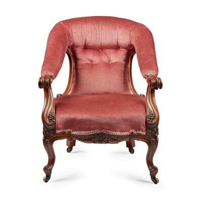 the button upholstered back leading to downswept padded open arms ending in carved scrolling hand terminals, above a wide stuffover seat with a flower carved seat rail and cabriole legs with brass castors, covered in rose pink plush upholstery