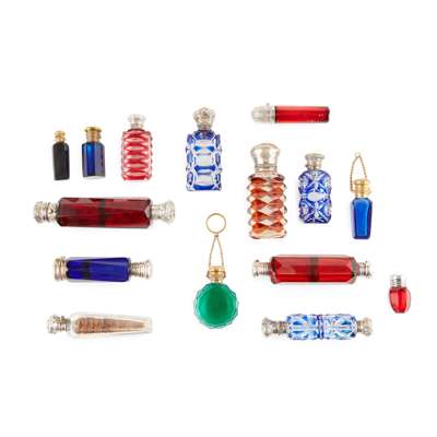to include four double-ended examples in coloured facetted glass with white metal mounts; and eleven other examples in coloured glass, clear glass and blue and red flash glass, some with white metal mounts