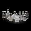 including a pair of flattened octagonal bottles cut with star motifs with a silver collar and flattened star cut stoppers, 16.3cm high; a square section bottle and stopper, each side cut with a stylised flower motif, with chased floral and scroll silver mounts and hinged cover, 14.5cm high; a bottle of baluster form with hobnail and star cutting and a hexagonal stopper, 20.5cm high; three globular vessels with silver covers; and a cylindrical jar and foliate chased cover, 15cm high; together with a ribbed glass small glug-glug decanter with silver mounted collar, 16cm high