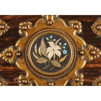 of cantered square form with Gothic style gilt brass strapwork mounts, the cover with a central pietra dura floral roundel, opening to a fitted blue velvet interior with four square gilt brass topped bottles