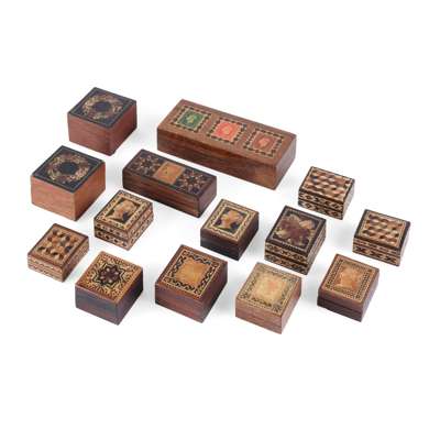 comprising of one box with three George IV stamps and geometric patterns, 12cm long, 5cm wide; one box with a Queen Victoria stamp and star motifs, 8cm long, 3cm wide; three boxes with Queen Victoria's head, 4.5cm long, 3.5cm wide; two square flower wreath boxes, 5cm by 5cm; three 'tumbling cubes' boxes, 3.5cm long, 4cm deep; two boxes with Queen Victoria stamps enclosed by a wavy pattern, 4.5cm long, 4cm wide; one box with a floral bouquet, 4.5cm long, 4cm wide; one square box with a star motif, 4cm by 4cm