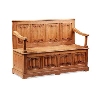 the four-panel back above a box seat with hinged cover flanked by open arms, above a base with corresponding linen-fold carved panels