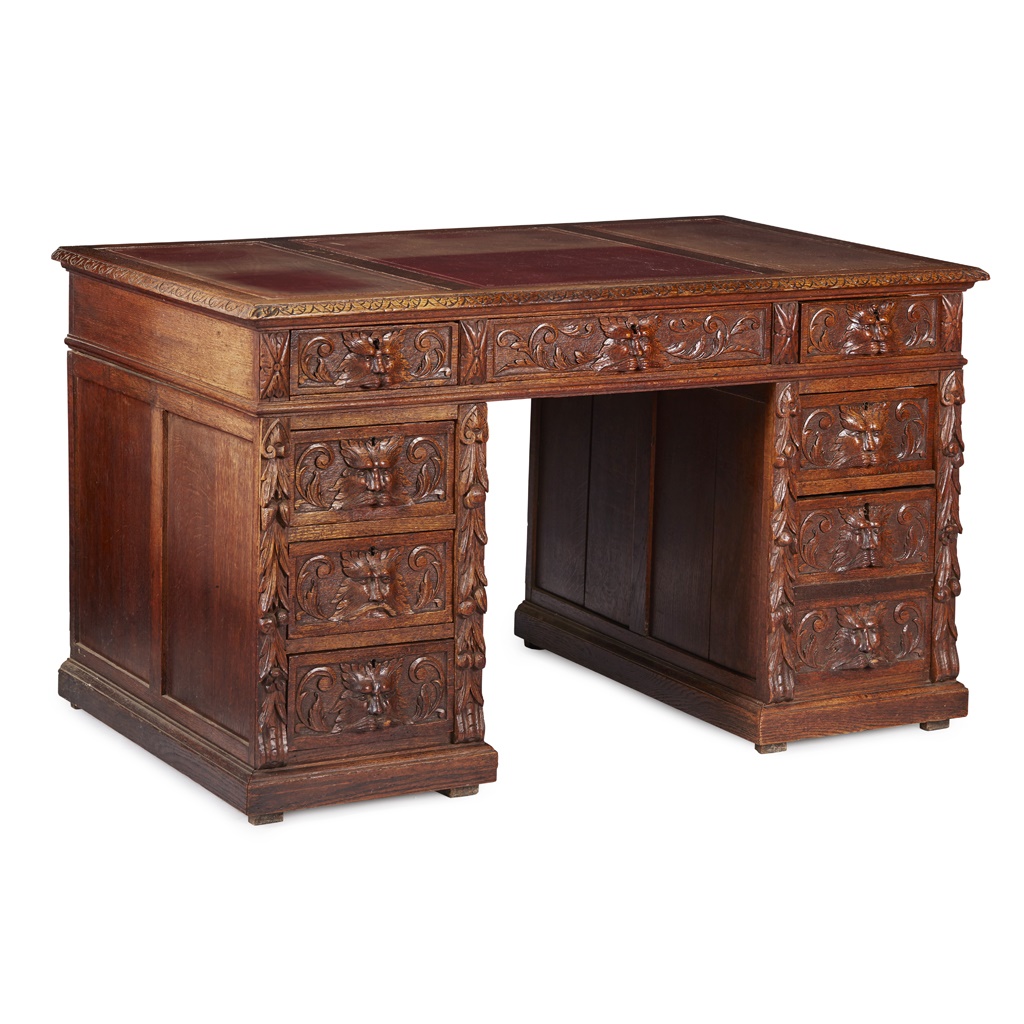 VICTORIAN CARVED OAK PEDESTAL DESK