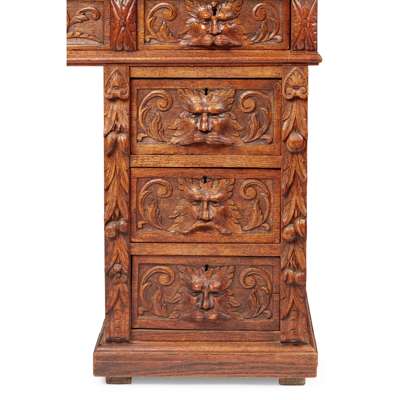 the rectangular top with three red leather inserts and leaf carved edge, over three frieze drawers, raised on pedestal supports of three short drawers carved with Green Man masks, flanked trailing laurel garlands on the corners