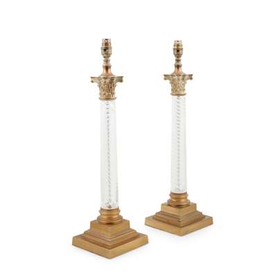 PAIR OF BRASS AND GLASS COLUMN LAMPS
