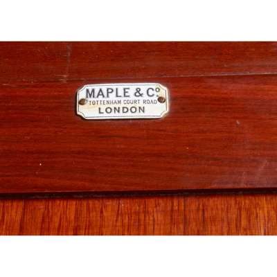 comprising a dressing table with mirror, marble topped washstand with tile back and mirror, and wardrobe with mirrored door, sliding trays, drawers, and a hanging cupboard, bearing ivorine trade label and stamped MAPLE & CO.
