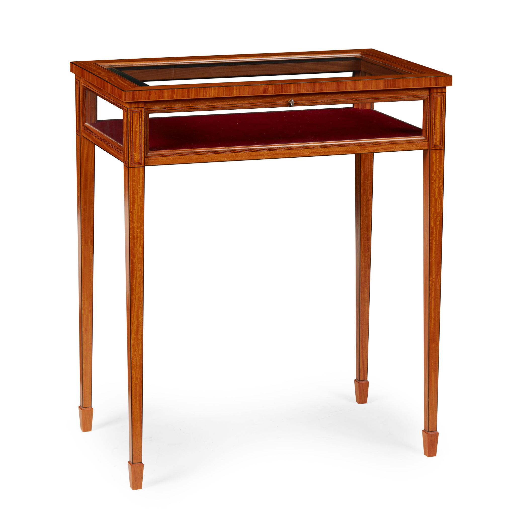 with ebonised stringing and kingwood banding, the hinged glazed rectangular top of plain form above glazed side panels and a maroon velvet lined interior, raised on tapering legs with spade feet
