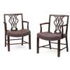the square backs over a pierced and interlaced splat and concave stuffover seats, flanked by open arms, raised on moulded and beaded square legs joined by H-stretchers