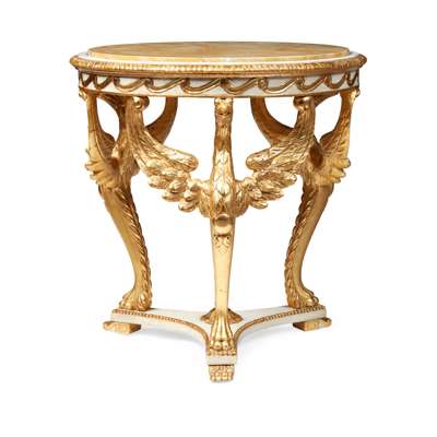 the circular yellow marble insert top in a gadrooned moulded border above a Vitruvian scroll frieze, raised on carved eagle monopodia and concave tripartite base
