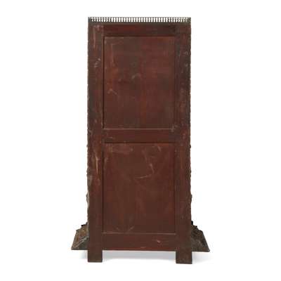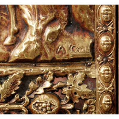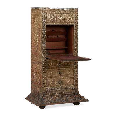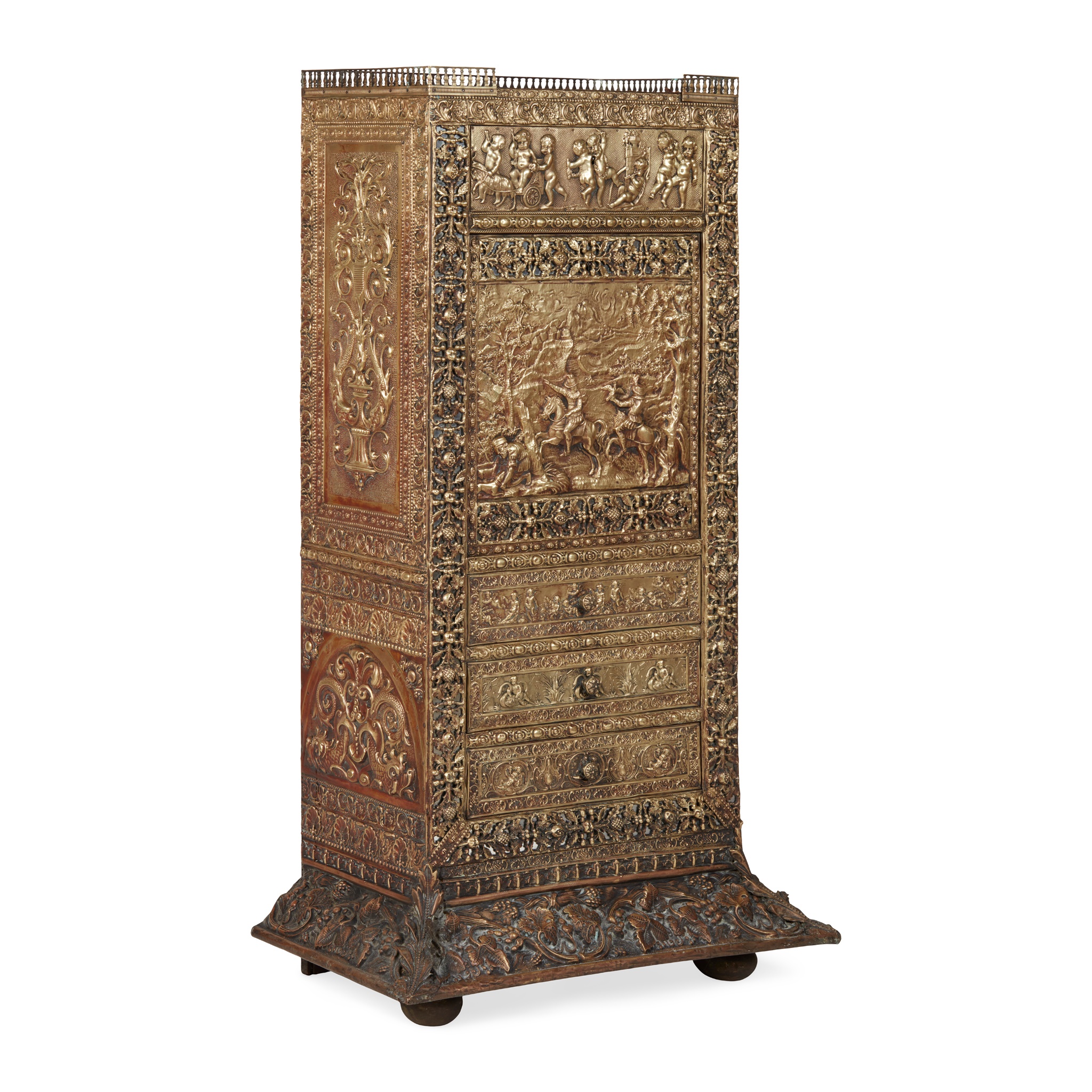 the three-quarter brass gallery above a frieze with putti at play over a fall front depicting a hunting scene with an indistinct signature, opening to an interior fitted for writing, over three long drawers, on a projecting base, the remaining surfaces covered in repousse brass panels with urns, dolphins, and fruiting vines, on bun feet