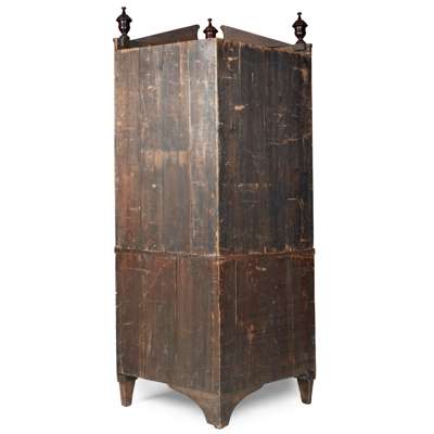 the broken arch pediment with urn finials above a pair of recessed panel doors, on a base with two further doors, opening to a black painted shelved interior, all profusely inlaid with flowering urns, equestrian figures, cornucopias, flower trails and foliate scrolls, raised on square tapered feet