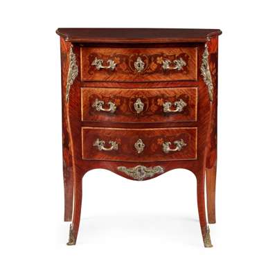 of small size, the serpentine rouge marble top with a moulded edge above three long drawers with floral marquetry, raised on slender cabriole legs with gilt bronze mounts